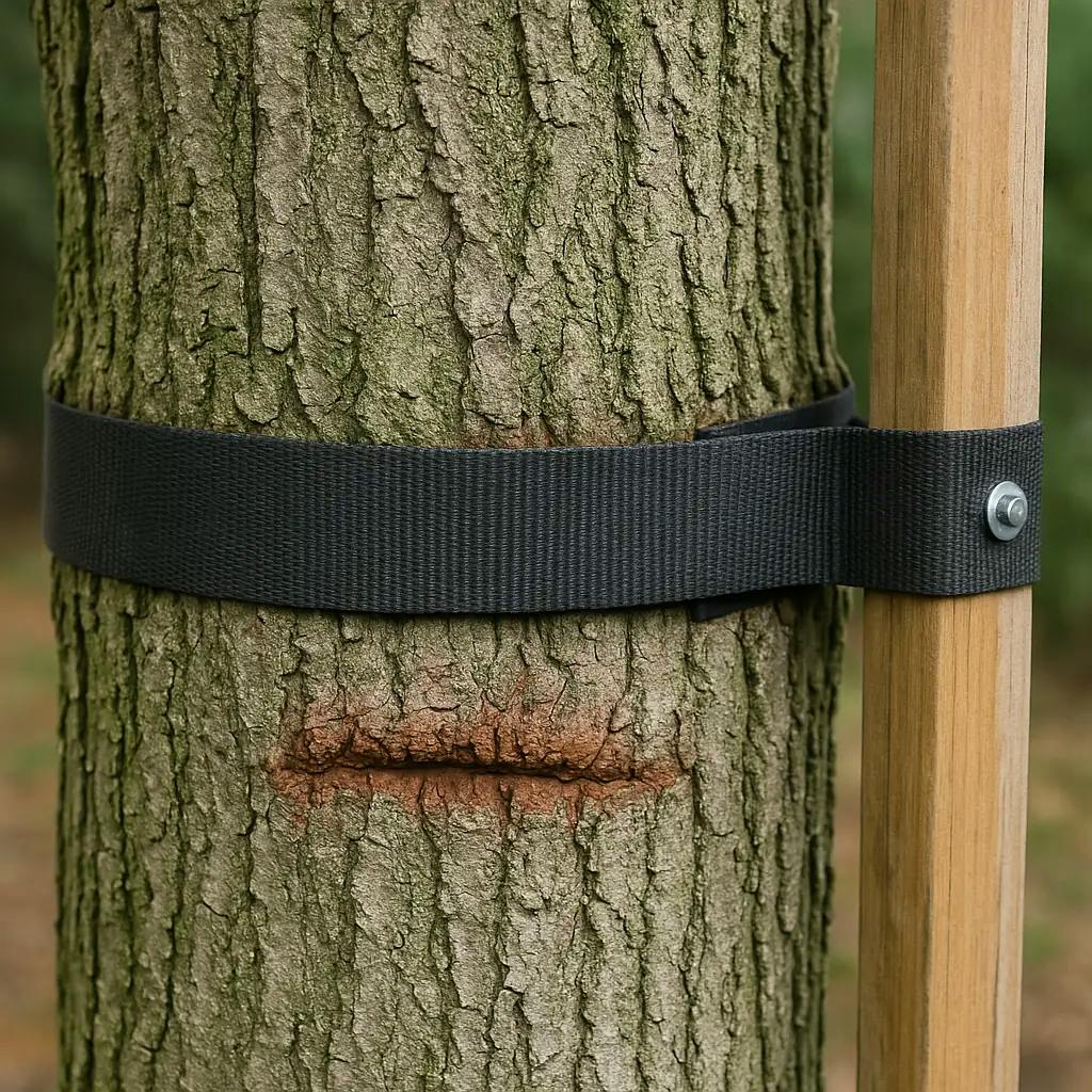 Verwende flexible Gurte aus Gummi oder Stoff, um eine direkte Reibung oder Einschnürung des Baumes zu vermeiden. Prüfe regelmäßig, ob die Gurte locker genug sitzen, um das Baumwachstum nicht zu beeinträchtigen.
