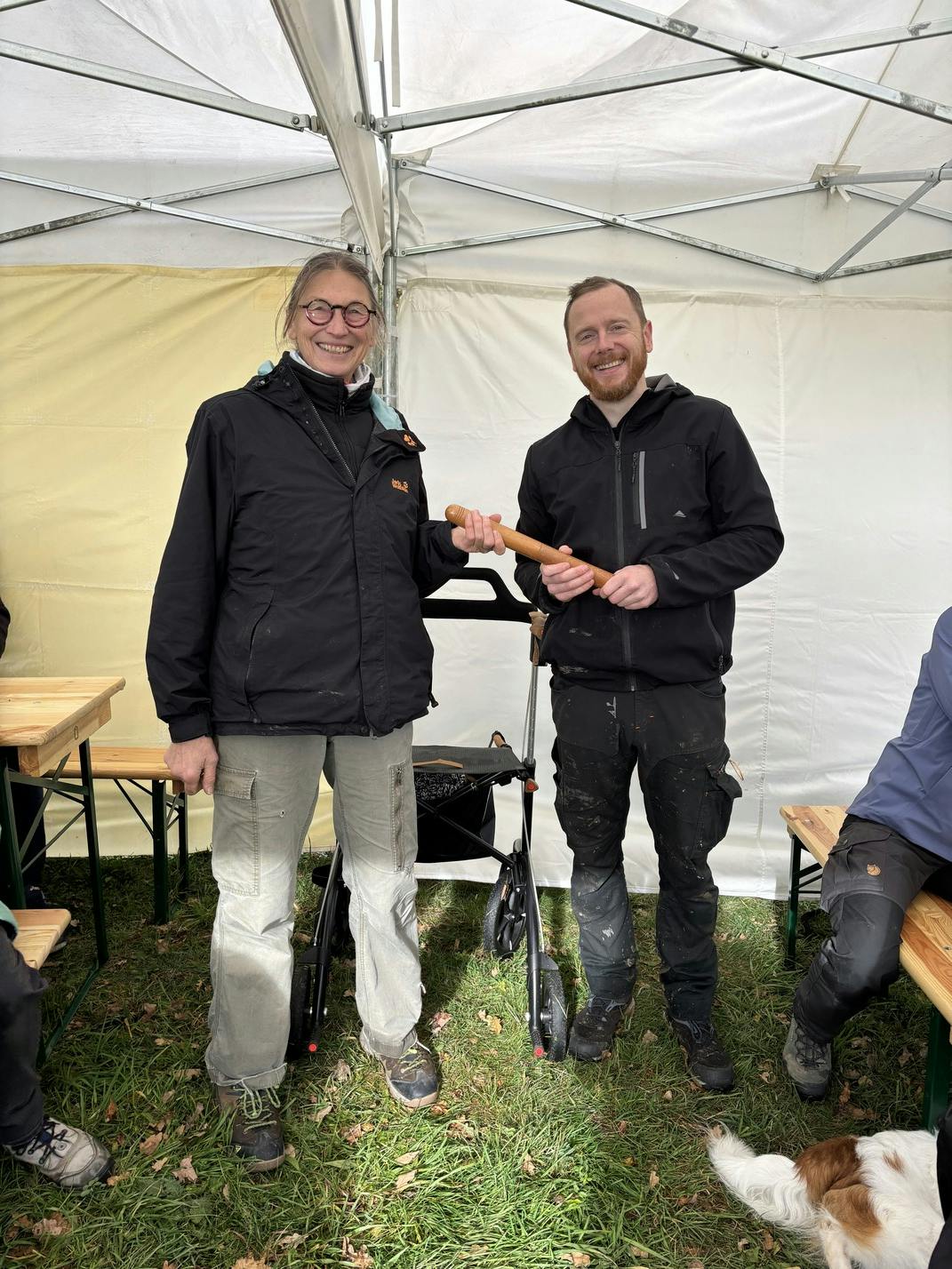 Die Vorsitzende des BSV, Christiane Janetzky, übergab einen hölzernen Staffelstab an Lukas Duraj, unseren Vorsitzenden. Im Inneren des Stabs befand sich eine Dokumentation aller bisher gepflanzten Bäume, ein Zeichen dafür, dass das Projekt mit seiner Geschichte und Bedeutung fortbesteht.